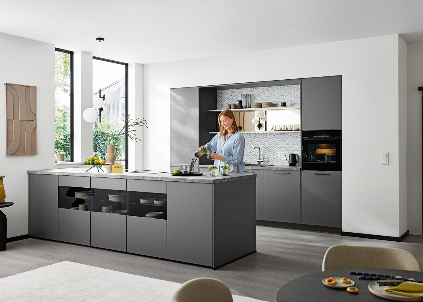 Bei MONDO Lenzen trifft das Bestsellerdekor Schwarzbeton auf die Trendfarbe Jade. Die extrem matte Oberfläche dieser Lackfront fühlt sich besonders weich an und ist gleich-zeitig extrem unempfindlich und resistent gegen Fingerabdrücke. Master Oak Nachbildung schafft im Handumdrehen eine angenehme Wohlfühlatmosphäre.