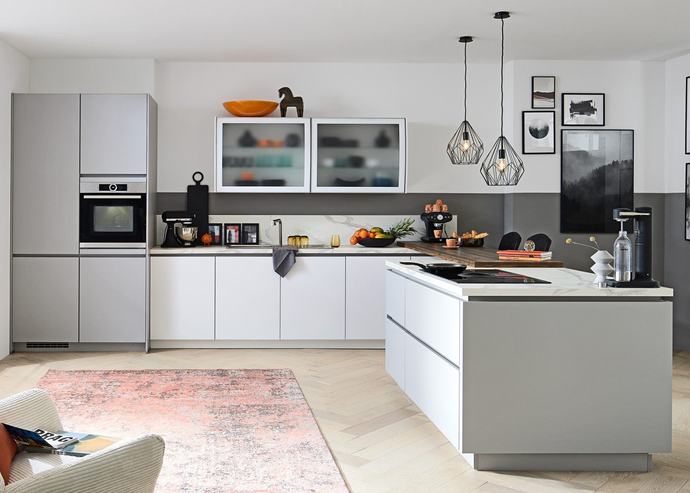 MONDO TORNA kombiniert supermattes steingraues und alpinweißes Lacklaminat mit edlen Arbeitsplatten in Marmor Venato Bianco Nachbildung. Zeile und Küchenblock sind durch einen Tresen miteinander verbunden. Ein weiteres gestalterisches Highlight bilden die exklusiven MONDO Wandschränke. Die bombierten Glasfronten in Rahmenoptik lassen sich ganz einfach nach oben schwenken. Als Wandschränke bieten sich verschiedene MONDO Exklusivausführungen an - mit Schwingklappen oder Faltlifttüren samt integrierter LED-Lichtleiste, alternativ mit Segmentglastüren oder mit Fronten in Kacheloptik. Die einzigartigen Schränke sind kompatibel mit allem MONDO Küchen.