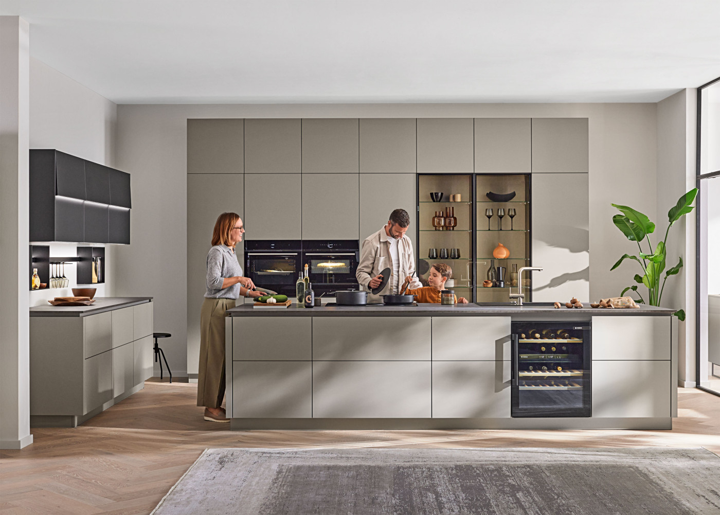 MONDO Esilia verkörpert stilvolle Zurückhaltung und höchste Verarbeitungsqualität. Fronten, Wangen und Sockel in Taupegrau ultramatt verleihen dem Ambiente eine ruhige, edle Ausstrahlung, während der warme Farbton mit feinem Braunanteil für moderne Wohnlichkeit sorgt. Die grifflose Gestaltung mit komfortabler Push-to-Open-Technik betont die klare Linienführung und unterstreicht den puristischen Charakter. Vitrinen mit schwarzen, ultraschlanken Alu-Rahmentüren und integrierten Griffprofilen setzen elegante Highlights und leiten zum Wohnbereich über.