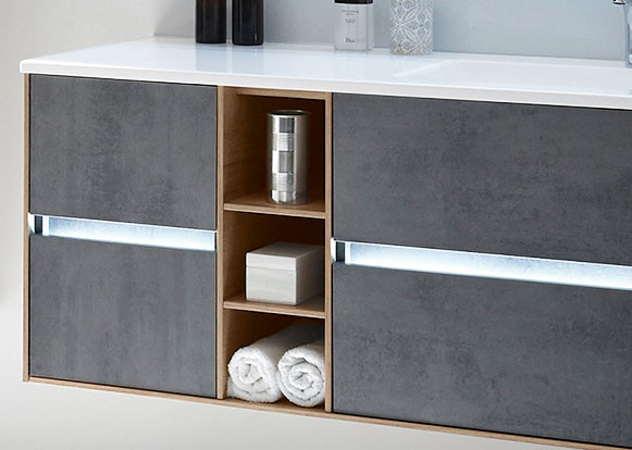 Schublade mit Dämpfung und Selbsteinzug. Inklusive LED-Profil mit Bewegungssensor für Grifffugen. Ohne Armatur und Dekoration.