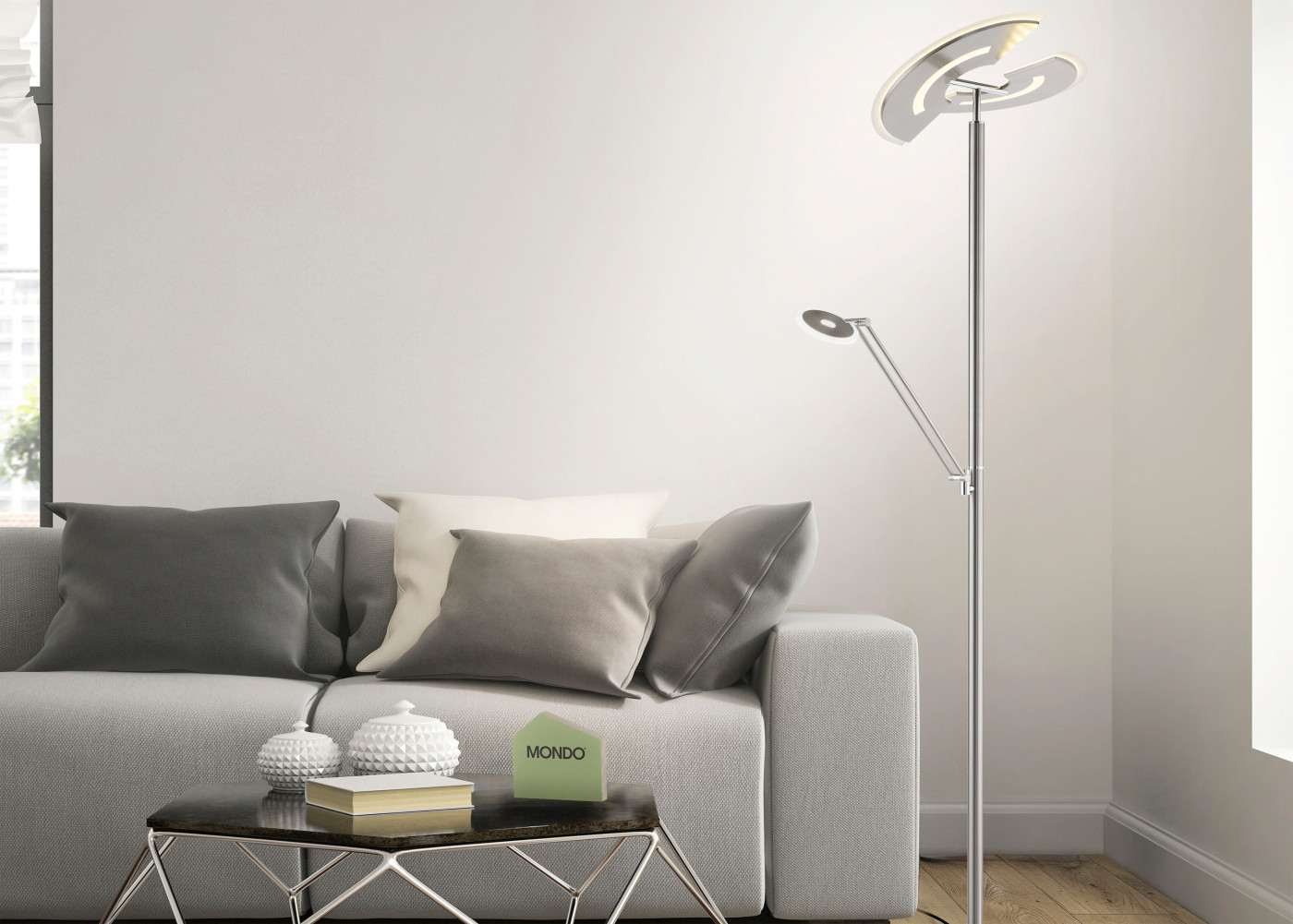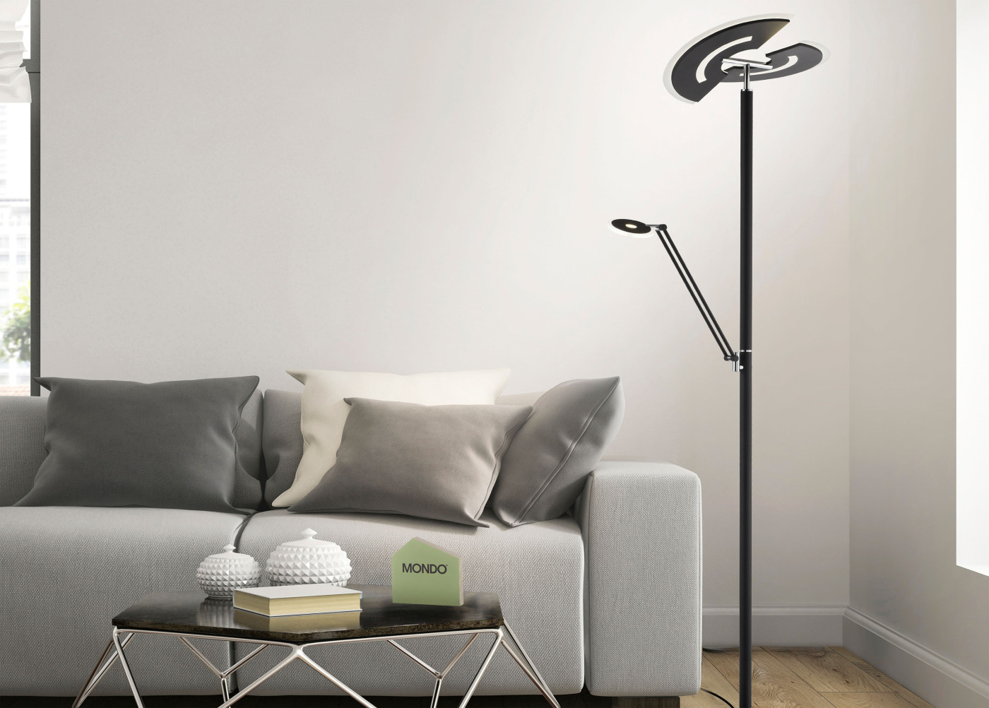 Die Stehleuchte Mondo Rimo kombiniert modernes Design mit flexibler Lichtsteuerung. Ausgestattet mit zwei LED-Boards (38 W und 6 W, 2700-5000 K) lässt sich das Licht individuell dimmen und die Farbtemperatur mühelos anpassen. Ein Doppelklick an den Tastdimmern wechselt komfortabel zwischen Dimm- und CCT-Modus - für perfekt abgestimmtes Licht in jedem Raum.