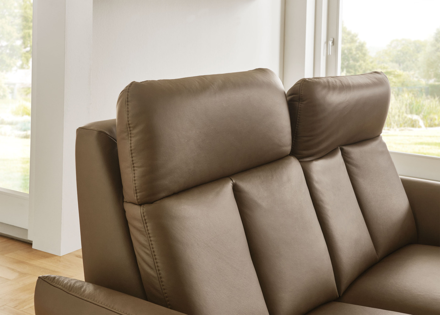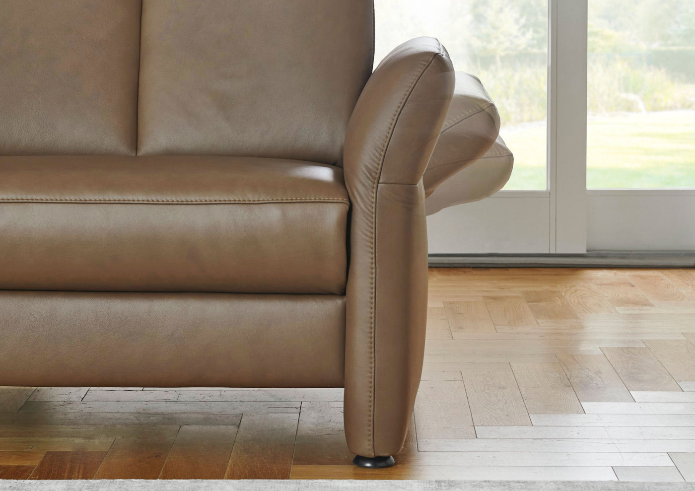 Sofa 2,5er im Lederbezug Vivre noce mit Federkern und Rücken echt. Inklusive manuelle Kopfteilverstellung, Liegearmlehne links und rechts sowie motorische Vorziehbank.