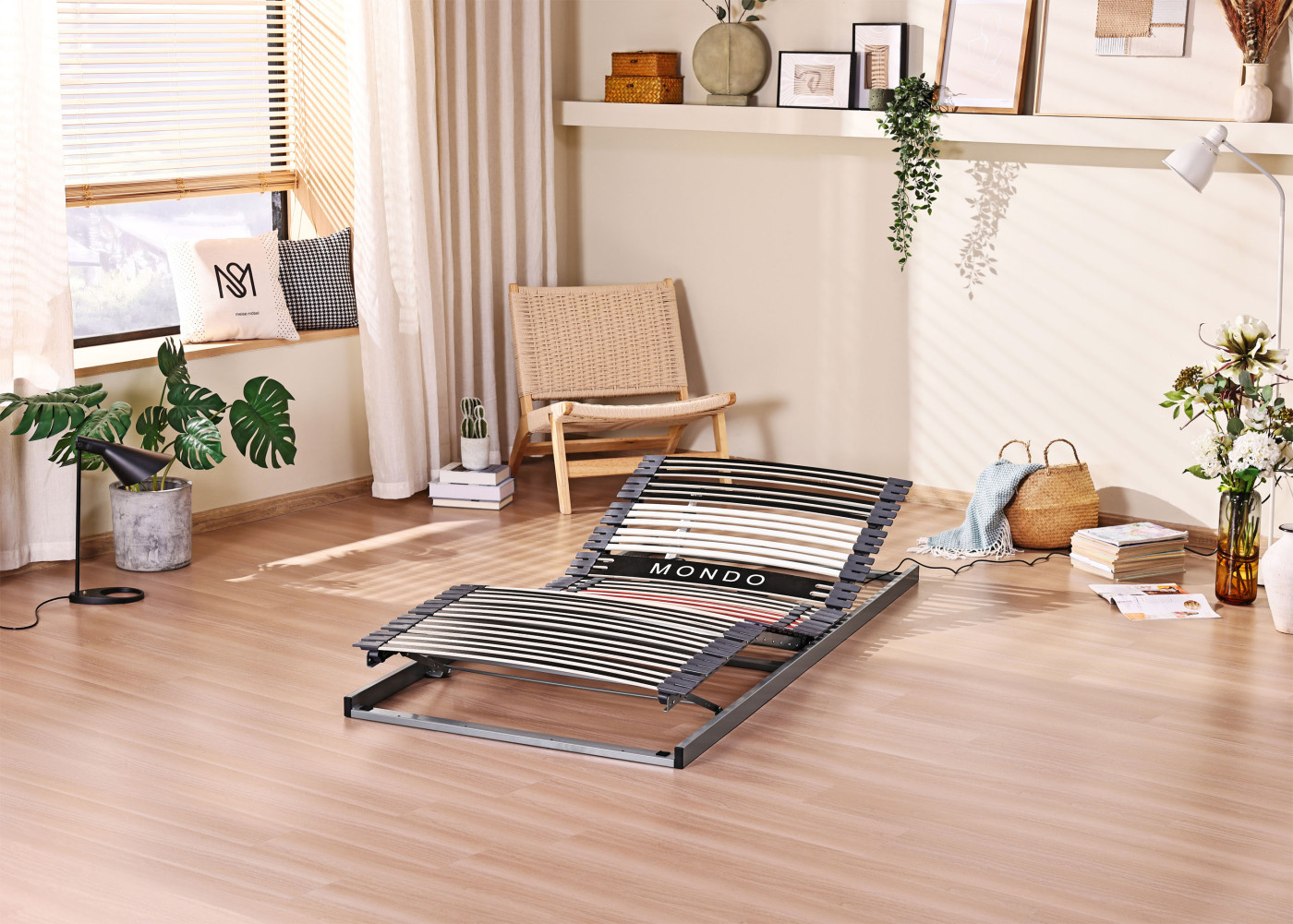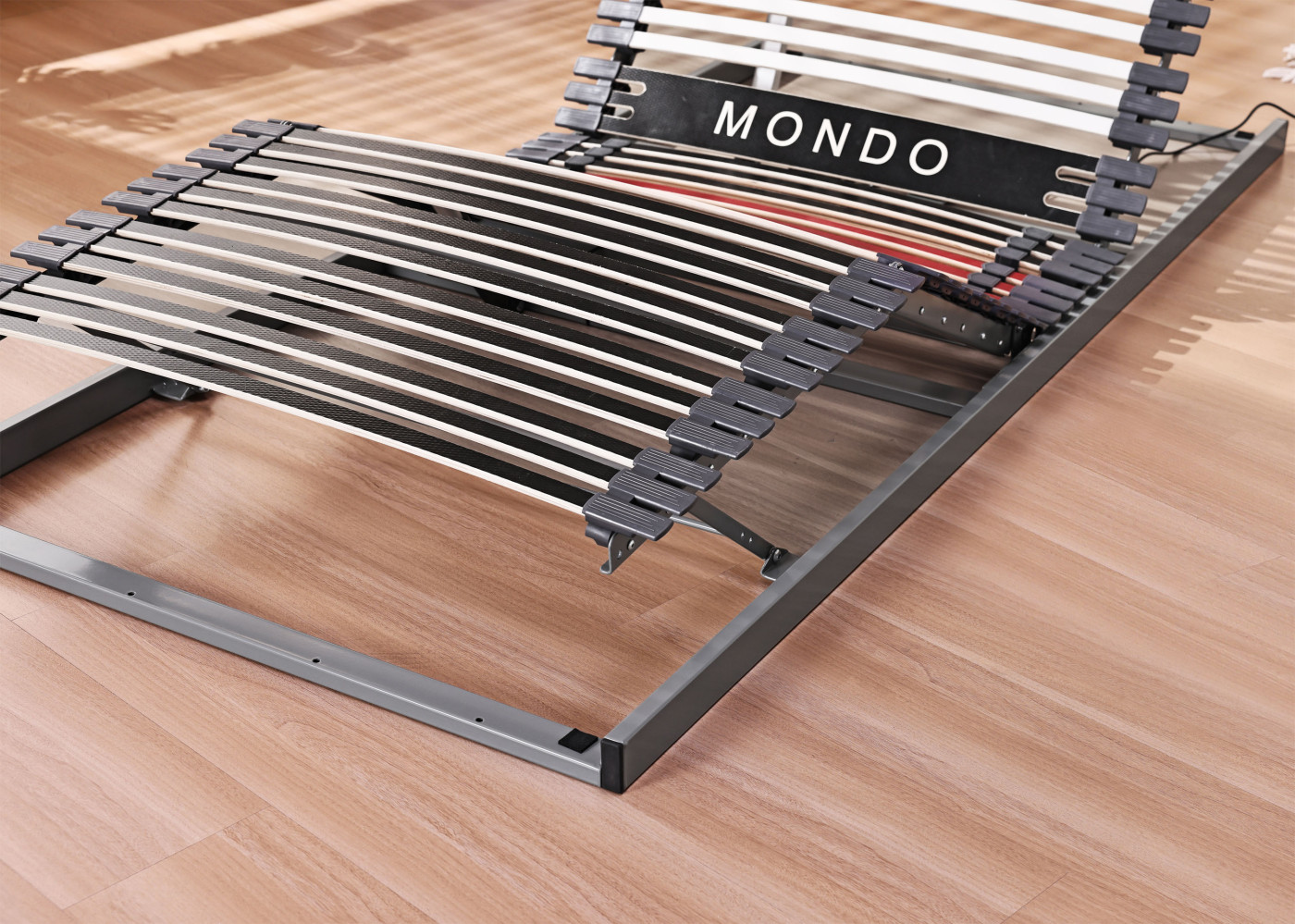 Inklusive 42 Federholzleisen, Kopf- und Fußteilverstellung, 9-fache Härtegradverstellung, inkl. 2 Schlaufen am Kopf- und Fußteil.