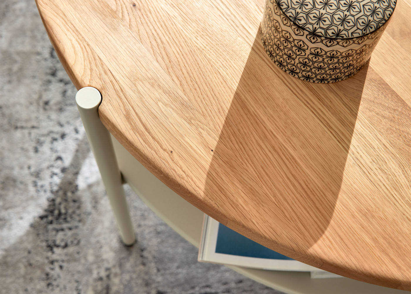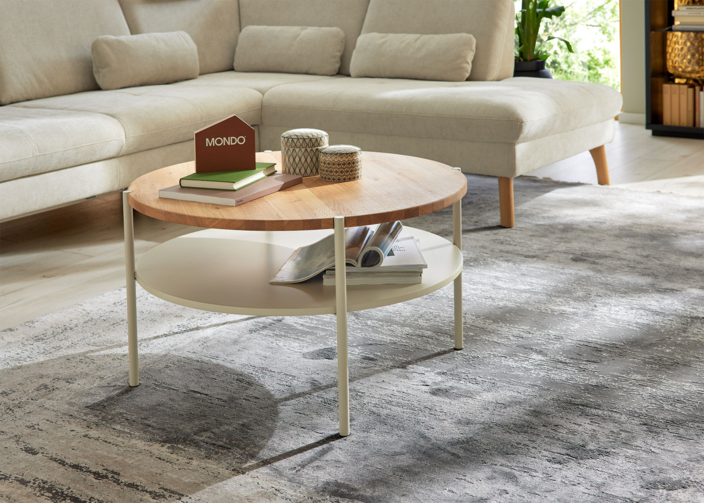 Der Couchtisch MONDO Kenza vereint natürliche Holzoptik mit moderner Leichtigkeit. Tischplatten aus massiver, geölter Wildeiche oder wahlweise Kernbuche setzen warme, lebendige Akzente. Ein pulverbeschichtetes Metallgestell mit praktischer Ablage - wahlweise in Beige oder Anthrazit - sorgt für stabilen
